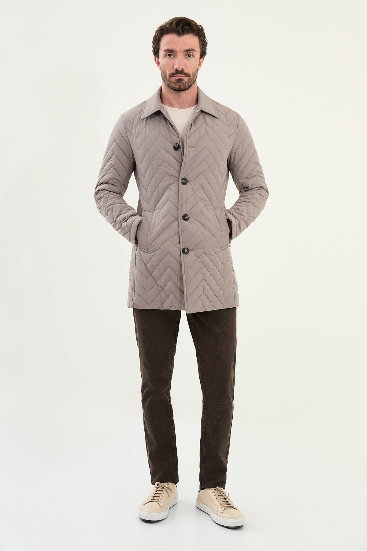 A refined quilted jacket featuring a sleek chevron pattern for a modern, structured look. Designed with a classic collar, front button closure, and lightweight insulation for warmth without bulk. Perfect for layering during cool weather, it offers a blend of sophistication and comfort for both casual and smart-casual occasions.