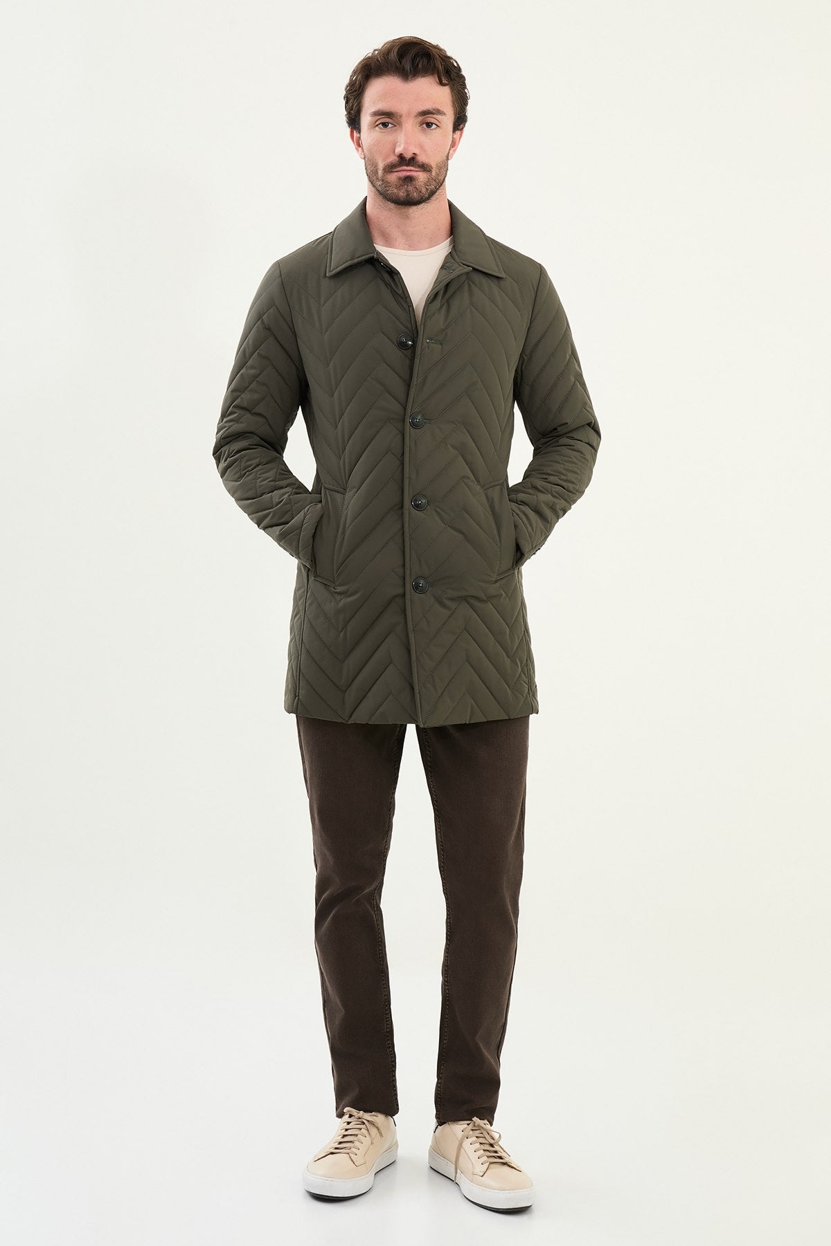 A refined quilted jacket featuring a sleek chevron pattern for a modern, structured look. Designed with a classic collar, front button closure, and lightweight insulation for warmth without bulk. Perfect for layering during cool weather, it offers a blend of sophistication and comfort for both casual and smart-casual occasions.