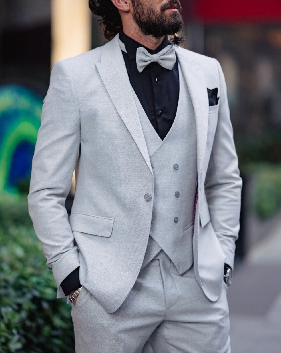 This sophisticated, special design linen fabric wedding suit is crafted with exquisite attention to detail. Its luxurious gray fabric brings a touch of refinement and style to any wedding, perfect for the modern and classic man. Elevate your look and your special day with this statement piece.