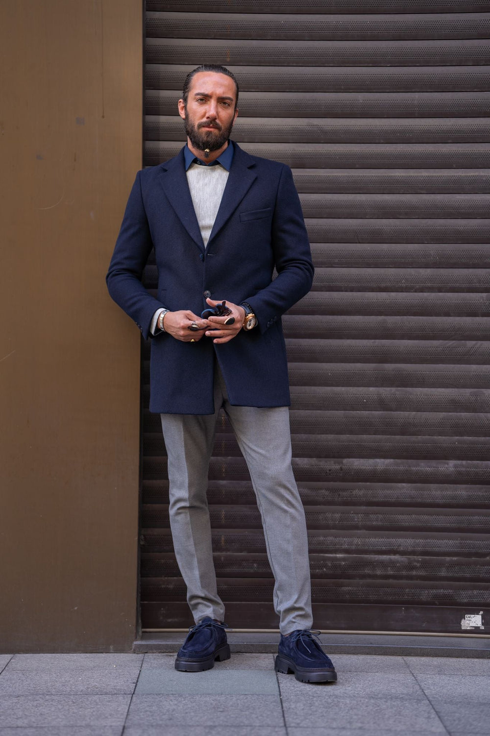 Special Design Slim Fit Double Breasted Cashmere Coat - Navy Blue