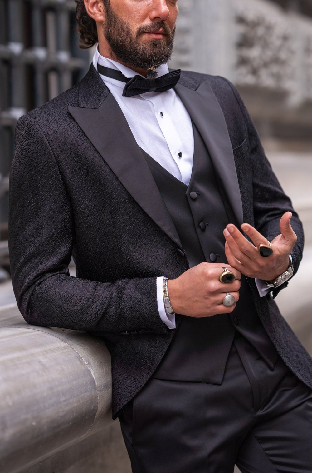 Special Design Slim Fit Self-patterned Satin Collar Tuxedo - Black